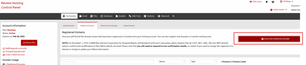 2) Click on “Register/Transfer Domain”.