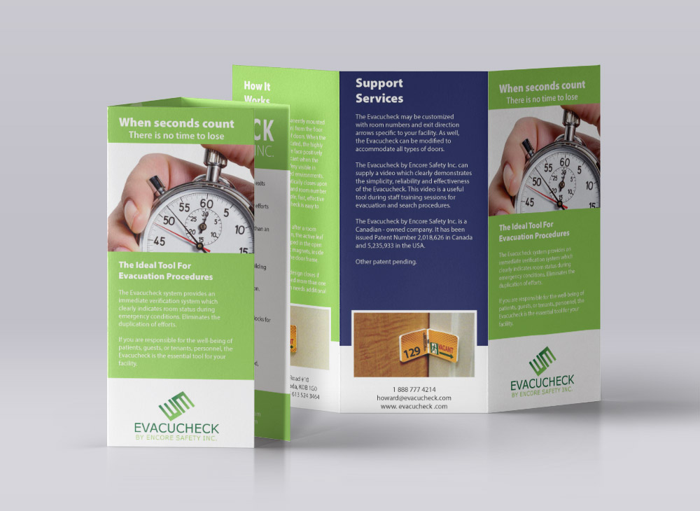BeyondINK Design & Print Project STATIONERY DESIGN AND PRINT PROJECT for Evacucheck, a new business card, and a three-fold brochure in English and French. Details Fall 2020 Business Card Brochure Categories Graphic Design